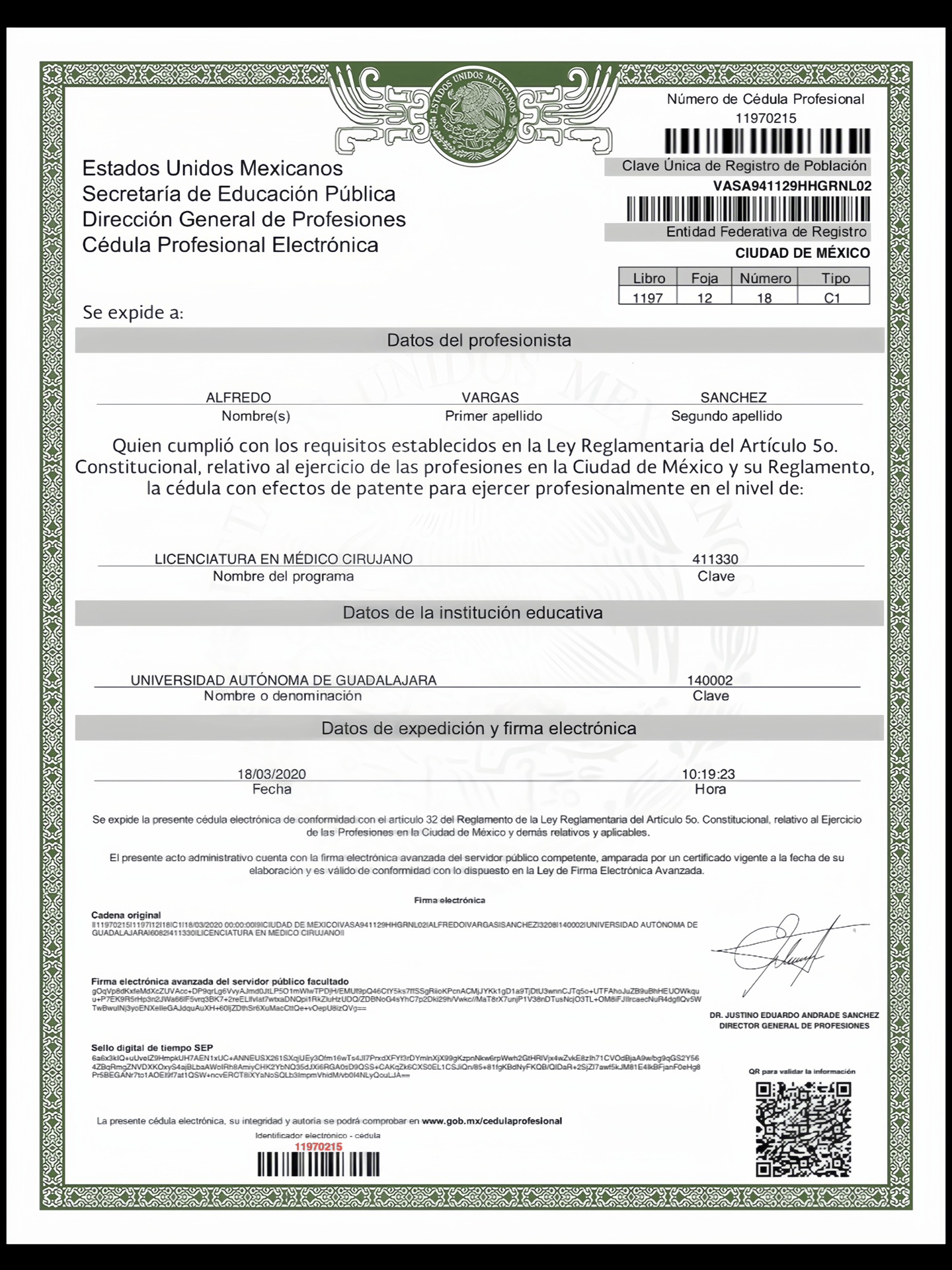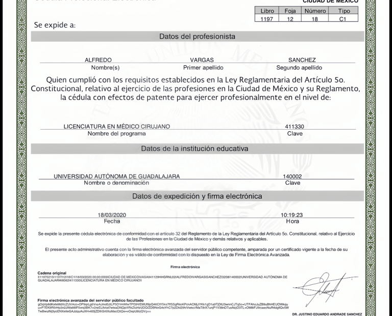 Cédula profesional electrónica de Médico Cirujano, número 11970215, expedida por la Universidad Autónoma de Guadalajara a través de la Secretaría de Educación Pública el 18 de marzo de 2020, la cual acredita legalmente al Dr. Alfredo Vargas Sánchez para ejercer su profesión.