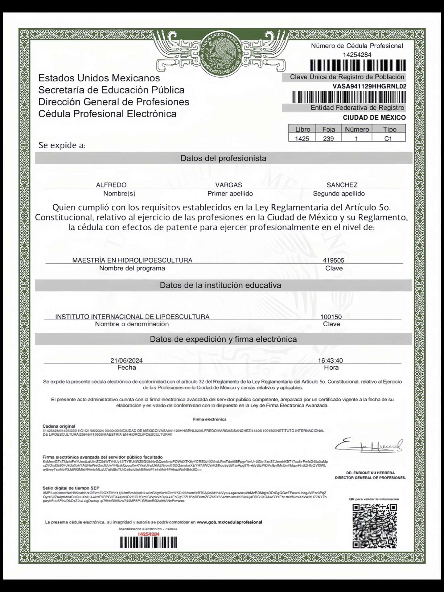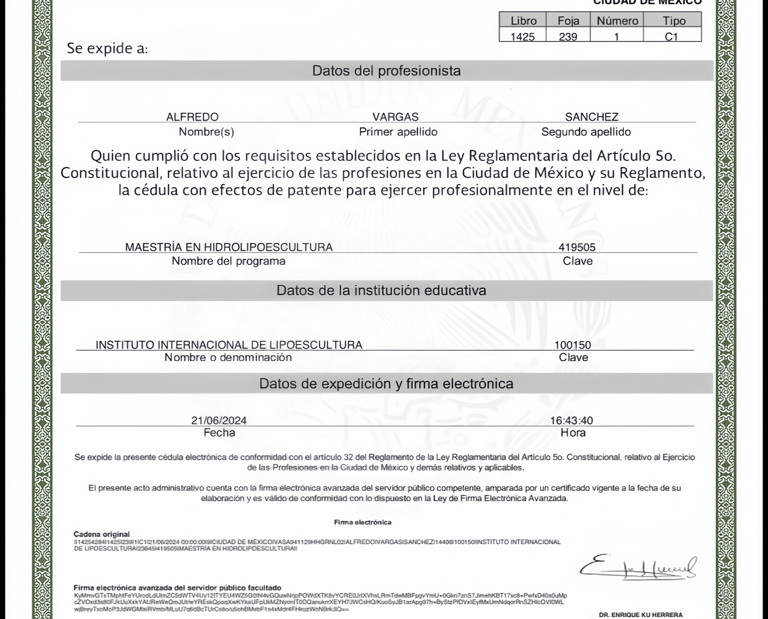 Cédula de posgrado electrónica de Maestro Lipoescultor, número 14254284, expedida por el Instituto Internacional de Lipoescultura a través de la Secretaría de Educación Pública el 21 de junio de 2024, la cual acredita legalmente al Dr. Alfredo Vargas Sánchez para ejercer un grado académico de especialización.